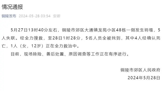 5月27日13时40分左右,铜陵市郊区大通镇龙苑小区48栋一侧发生坍塌,5人失联。经全力搜救,截至28日1时28分,5名失联人员全被找到,其中4人经确认死亡,1人(女,12岁)正在全力救治中。